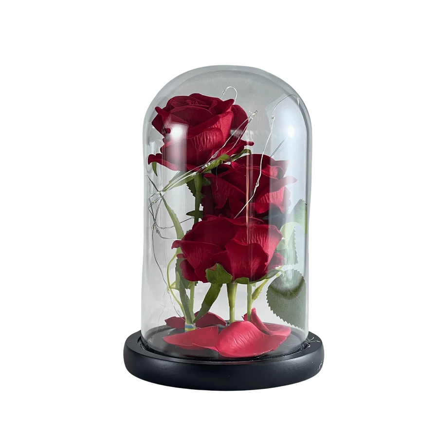 – A bársony textúrájú rózsák és a kristálytiszta üvegbúra összhangja luxus hatást kelt, amely bármely polcot, asztalt vagy polcon ékességként mutat. Exkluzív dekorációs elem az otthonodba vagy irodádba.
