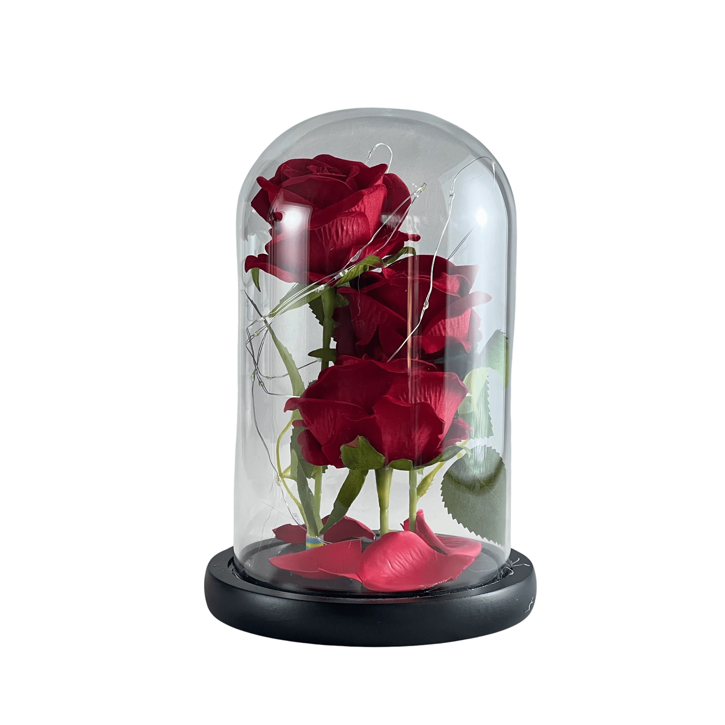 – Egy 14 cm átmérőjű és 22 cm magas elegáns üvegbúrában elhelyezett bársonyhatású rózsák több színben, melyek meseszerű, romantikus hangulatot árasztanak.