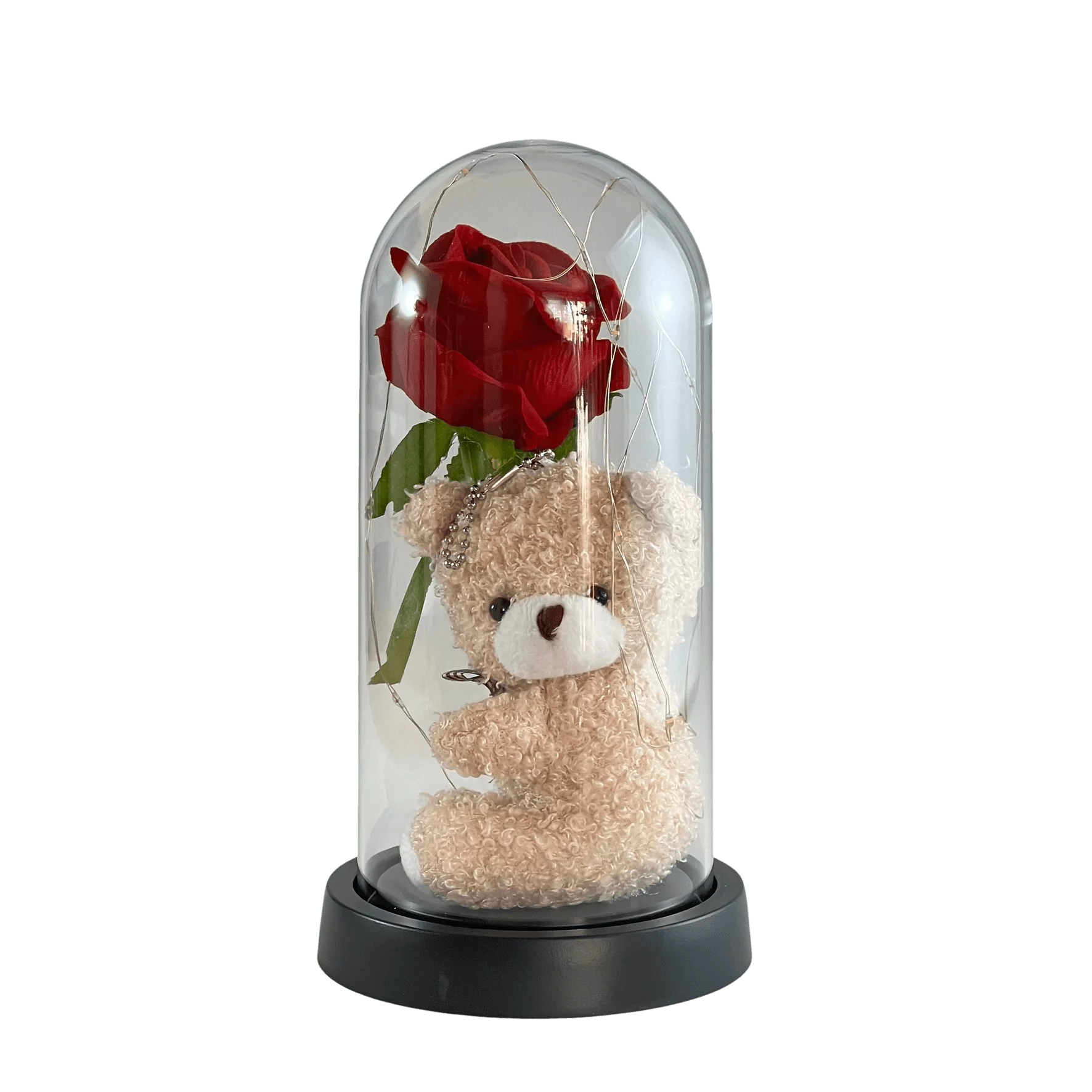 A búra megvédi a belső elemeket a portól és a környezeti hatásoktól, így a benne lévő rózsa és a maci figura évekig megőrzi eredeti állapotát.