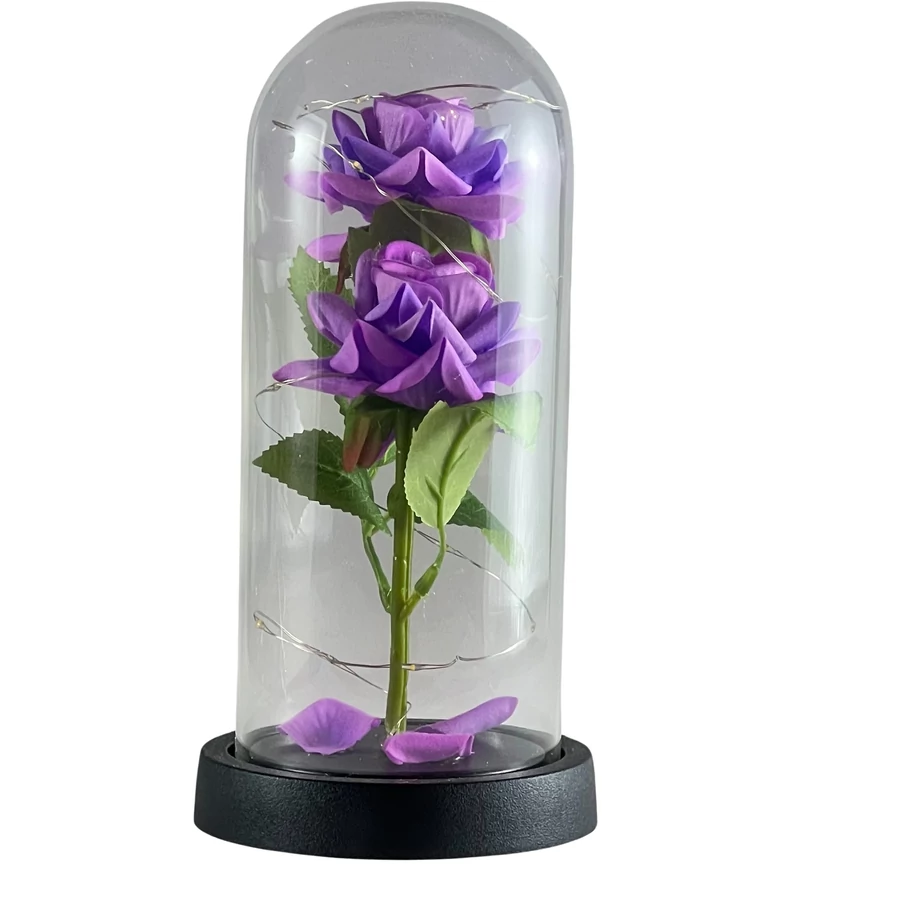A lila rózsa üvegbúrában LED világítással egy elegáns és időtálló ajándék, amely tökéletes választás különleges alkalmakra. A rózsa évekig megőrzi szépségét. A beépített LED világítás különleges hangulatot teremt, ideális éjjeli fényként vagy dekorációként.